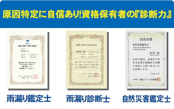 - 雨漏り診断士、雨漏り鑑定士などの雨漏りに関する有資格者が対応